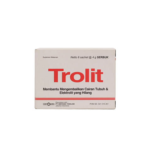 Larutkan 1 sachet Trolit ke dalam 200 ml air atau sesuai dengan takaran yang dianjurkan pada label. Aduk larutan sampai merata sebelum diminum.