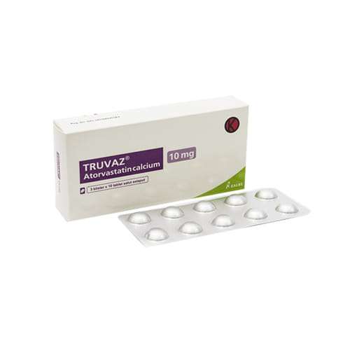 Truvaz 10 Mg 10 Tablet mengandung atorvastatin yang bekerja dengan cara enzim yang bertugas memproduksi kolesterol di hati. Dengan begitu, jumlah kolesterol jahat dalam darah akan turun.