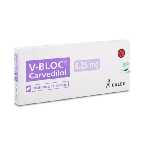 V-Bloc Tablet mengandung carvedilol yang bekerja menurunkan denyut jantung dan melebarkan pembuluh darah. Dengan begitu, tekanan darah menurun dan beban kerja jantung berkurang.