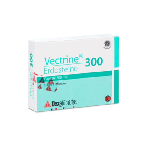 Vectrine 300 mg Kapsul mengandung erdosteine yang bekerja dengan cara mengencerkan dahak yang terdapat di saluran pernapasan. Dengan demikian, dahak dapat lebih mudah dikeluarkan saat batuk.