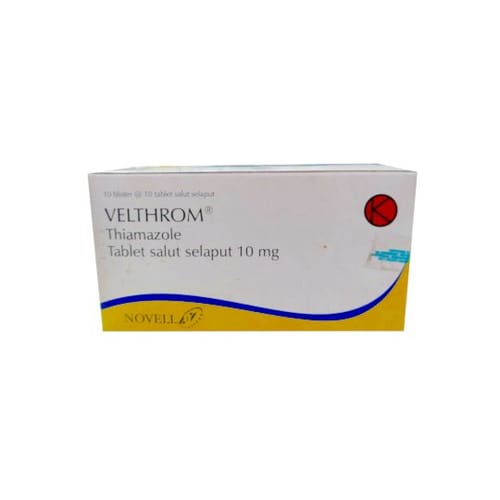 Velthrom 5 mg Tablet memiliki kandungan bahan aktif Thiamazole. Thiamazole merupakan obat golongan antitiroid yang digunakan untuk mengurangi produksi hormon tiroid pada penderita hipertiroidisme.