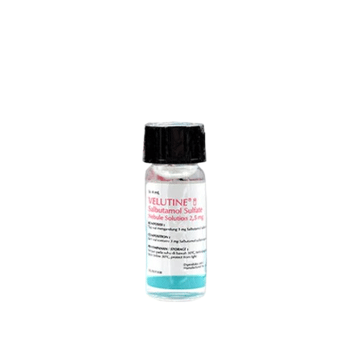 Velutine Inhalation Solution 2,5 mg memiliki kandungan bahan aktif Salbutamol sulfate yang digunakan untuk penatalaksanaan & pencegahan serangan asma. Penanganan rutin bronkospasme kronik yg tdk responsif thd terapi konvensional; asma akut berat (status asmatikus). Konsultasikan kepada dokter terlebih dahulu apabila akan digunakan pada pasien dengan kondisi Tirotoksikosis, hipokalemia. Khususnya pd asma akut berat, penggunaan bersama dg derivat xantin, steroid, & diuretik, & oleh hipoksia. Pantau kadar kalium serum pd kasus hipokalemia. Glaukoma sudut tertutup akut, jika dikombinasi dg ipatropium Br. Hamil & laktasi. Interaksi dapat terjadi apabila digunakan bersamaan dengan obat-obatan seperti: *Salbutamol & obat penyekat beta non selektif spt propranolol; MAOI.