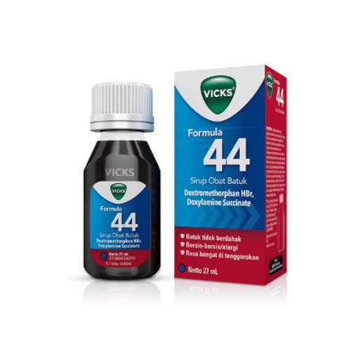 Vicks Formula 44 bermanfaat meringankan batuk tidak berdahak yang disertai bersin-bersin atau alergi. Vicks Formula 44 mengandung dextromethorphan HBr dan doxylamine succinate.