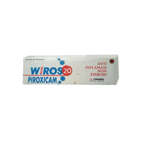 Wiros 20 mg memiliki kandungan bahan aktif Piroxicam 20 mg yang bekerja dengan menghambat enzim yang memproduksi prostaglandin, yaitu senyawa yang dilepas tubuh dan menyebabkan peradangan. Piroxicam menghambat siklooksigenase 1 dan 2 enzim secara reversibel yang mengakibatkan penurunan pembentukan prostaglandin prekursor (2 Cox-1) memiliki efek antipiretik (penurun demam), analgesik (anti nyeri) dan anti-inflamasi (anti radang). Obat ini digunakan untuk pengobatan: *Rheumatoid artritis *Osteoartritis *Ankilosa spondilitis *Gout akut *Gangguan muskuloskeletal Wiros 20 mg dapat dikonsumsi setelah makan. Konsultasikan terlebih dahulu kepada dokter apabila akan digunakan pada pasien dengan kondisi: *Riwayat alergi terhadap kandungan obat ini. *Wanita hamil dan menyusui. *Penderita dengan riwayat tukak lambung atau perdarahan GI. *Pasien dengan tekanan darah tinggi (hipertensi). Interaksi dapat terjadi apabila digunakan bersamaan dengan obat-obatan seperti: *Diuretik *Antikoagulan oral *Asam asetil salisilat *Simetidin Simpan di tempat sejuk dan kering, serta terhindar dari sinar matahari langsung.