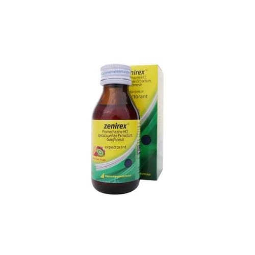 Zenirex Expectorant megandung Promethazine Hydrochloride, Guaifenesin dan Ipecacuanhae Extract.yang berfungsi untuk meredakan batuk yang berdahak atau batuk yang disebabkan oleh alergi.