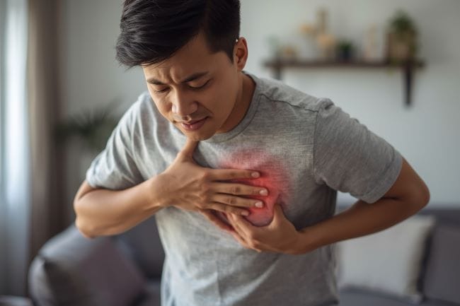 Masalah jantung merupakan salah satu penyebab paling serius dada sesak dan nyeri. Kondisi ini terjadi ketika aliran darah ke otot jantung terganggu, sehingga pasokan oksigen berkurang. Akibatnya, jantung “memberi sinyal” berupa nyeri dada, seperti ditekan, terasa berat, atau panas.