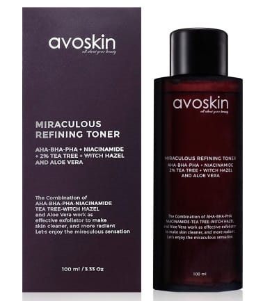 Sedang mencari produk eksfoliasi wajah untuk pemula? Mungkin, Avoskin Miraculous Refining Toner bisa menjadi pilihannya. Memiliki kandungan AHA, BHA, PHA, dan PGA yang dipadukan dengan niacinamide, tea tree 2%, witch hazel, serta aloe vera, toner ini efektif bisa membantu memaksimalkan proses eksfoliasi kulit.