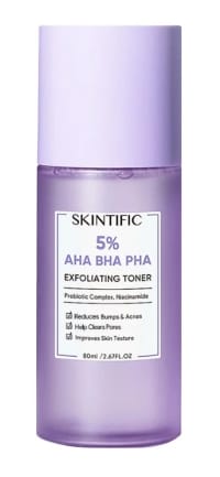 Jika sedang mencari produk eksfoliasi wajah untuk pemula, Skintific 5% AHA BHA PHA Exfoliating Toner bisa menjadi jawabannya. Soalnya, produk ini memiliki kandungan AHA 2%, BHA 2%, dan PHA 1%.